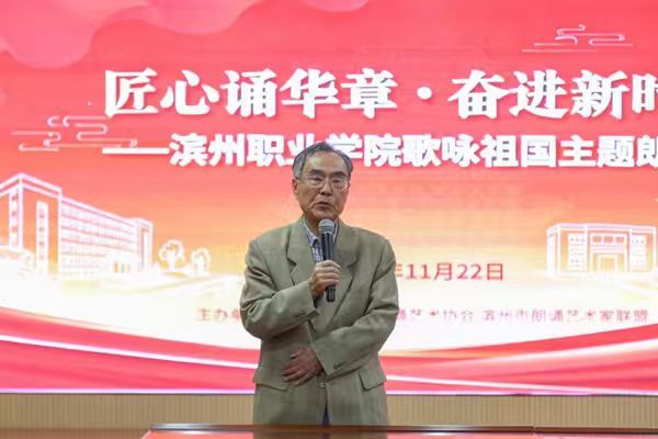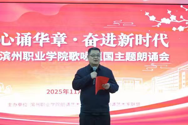 活动伊始,李超部长登台致辞。他强调,本次朗诵会是学校深耕职业教育、践行“以文化人、以文育人”理念的生动实践,鼓励青年学子以匠心铸梦、用青春报国,在职业教育的赛道上书写奋进篇章。随后,杨浩文先生分享诗歌创作背后的故事,字里行间满含对滨州大地的深情眷恋与对青年一代的殷切期许,引发全场共鸣。