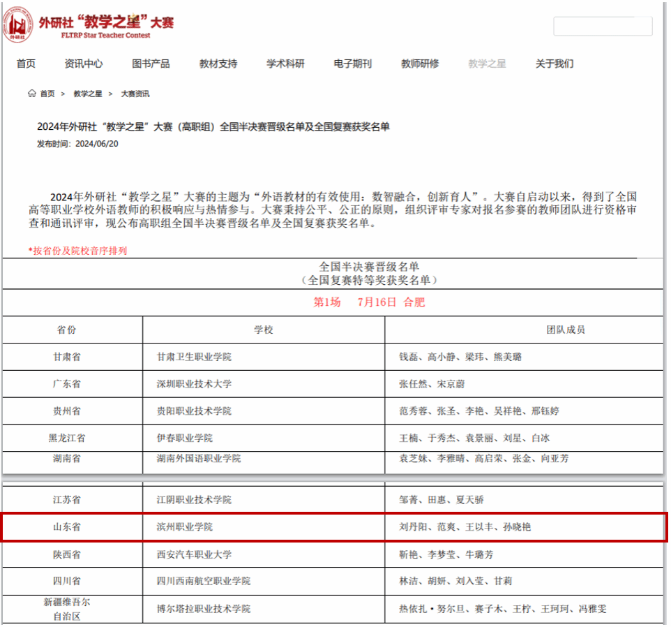 近日,2024年外研社“教学之星”大赛(高职组)全国复赛在线上进行。必威西汉姆官网平台外语团队喜获特等奖,进入全国半决赛。