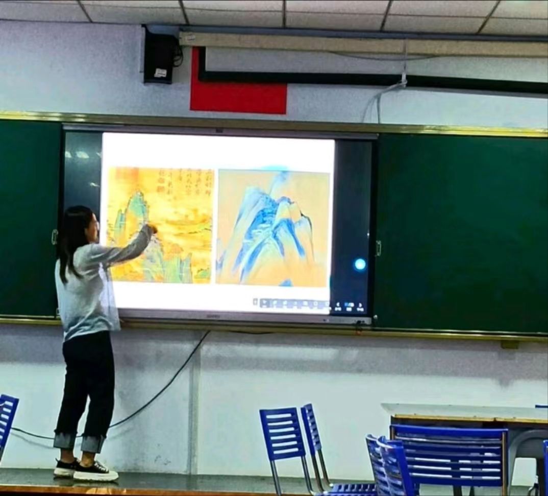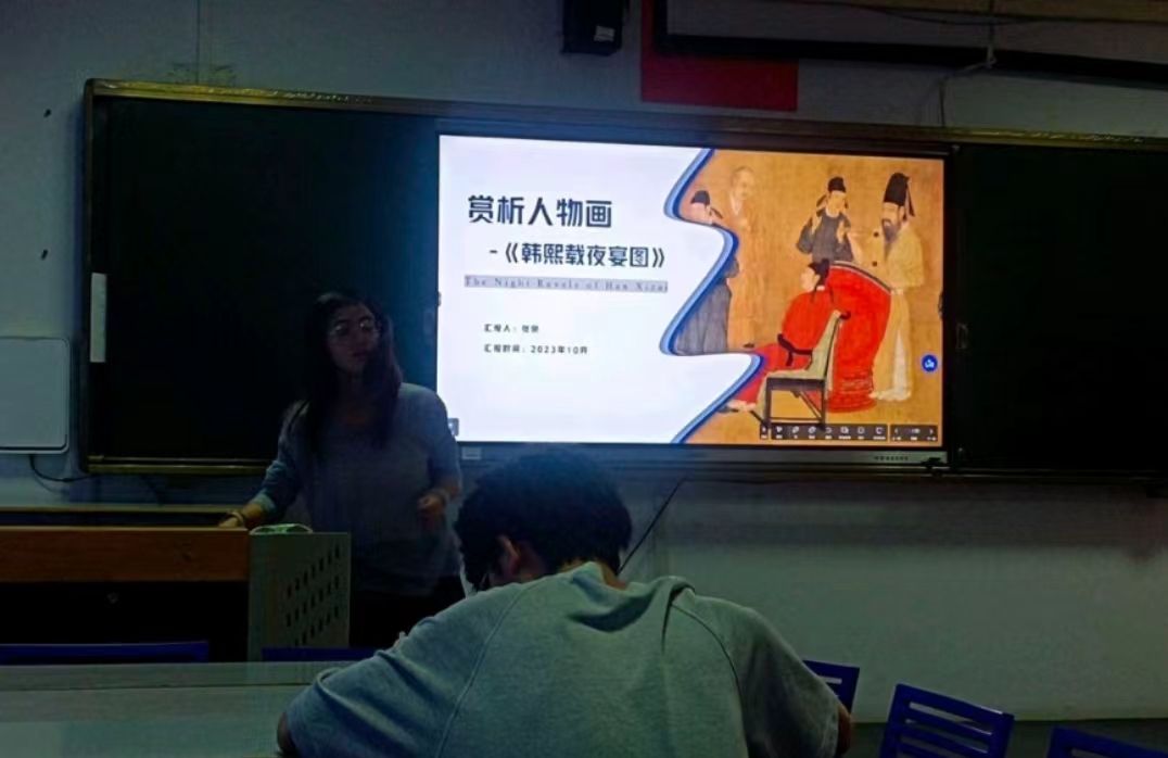 张老师从中西方经典美术作品的赏析着手,与同学们一同赏析了名家名作。作品包含了五代顾闳中的《韩熙载夜宴图》、宋代王希孟的《千里江山图》、清代朱耷的《荷石水禽图》以及西方著名画家梵高的艺术作品等。从多角度看作品的前世今生,在赏析经典作品的同时也让学生学会了如何去欣赏美术作品。讲座设置了互动环节,师生就经典美术作品的赏析相关问题进行了交流。总结阶段,张老师建议同学们重点关注当下以经典美术作品为载体的新的艺术形式,同时要强化保护文物、爱护文化的意识。