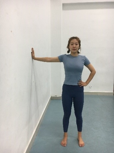 ·面对墙面,分腿站立。左手扶髋,右手指尖向上推墙,调整身体与墙面距离,使右手臂伸直,与肩同高。