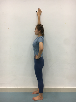 ·将两手依次向后上方抬起,指尖向上,手臂伸直,手掌扶墙。调整两手同高到最大幅度,将双腿缓慢伸直。
