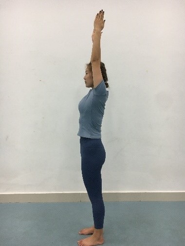 ·内侧手臂上举到最大幅度,手掌扶墙。外侧手掌扶髋。保持姿势的过程中,肩膀放松,找到内侧手掌带动手臂充分向上的延展感。