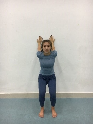 ·保持俩脚不动,双腿垂直于地面,两手依次沿墙向上到最大幅度,微收下颌,使颈部在脊柱的延长线,找到腋窝、肩膀、背部的伸展感。
