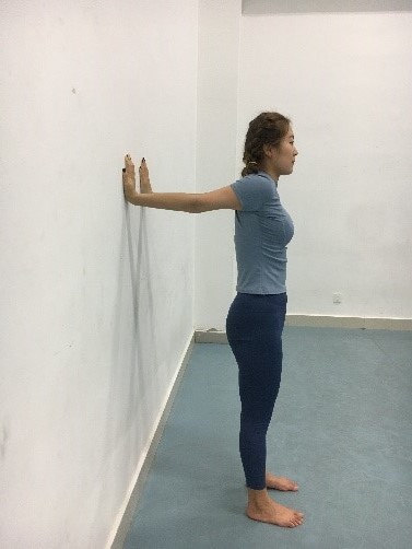·两臂内收,一上一下,同时向对侧方向水平伸展,手掌扶墙,找到最大幅度。颈部放松,与脊柱呈自然延长线。